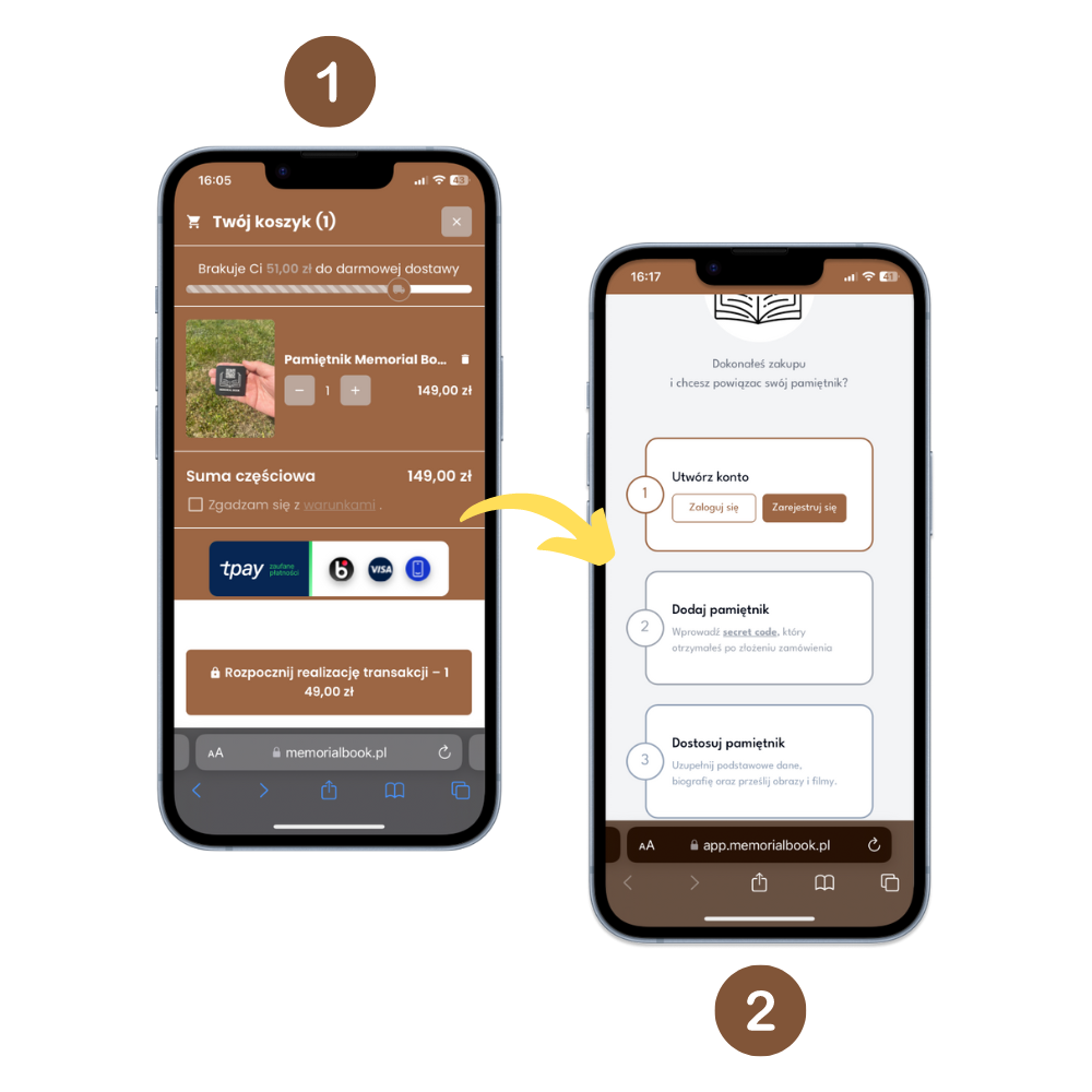 Po złożeniu zamówienia otrzymasz specjalny kod aktywacyjny który pozwoli Ci aktywować profil. Wejdź na stronę app.memorialbook.pl i utwórz konto a następnie wpisz kod aktywacyjny.