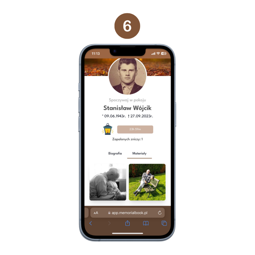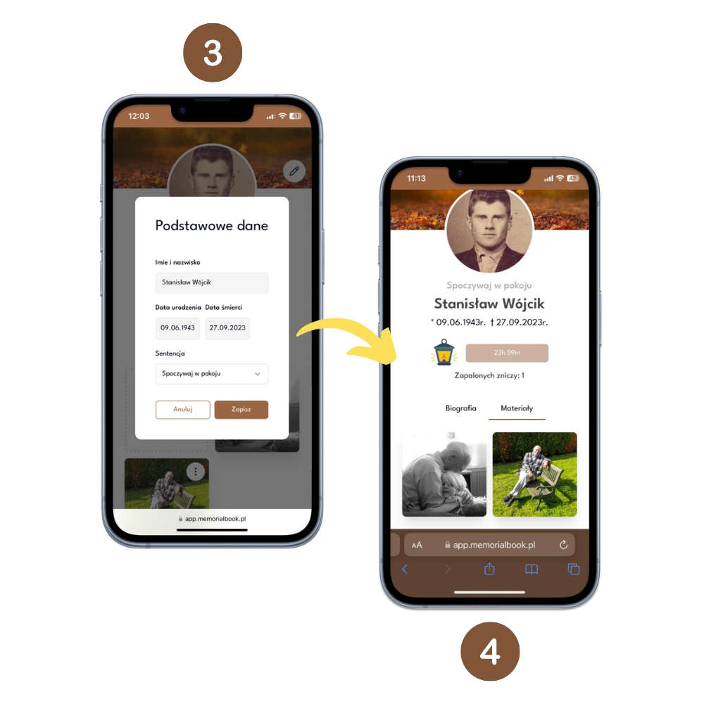 Gdy aktywujesz kod uzupełnij profil o wszystkie niezbędne dane takie jak imię i nazwisko, data urodzenia i śmierci oraz zdjęcia i filmy upamiętniające najlepsze chwile z życia bliskiej osoby. W miedzy czasie wyślemy do Ciebie specjalną tabliczkę z kodem QR, którą nakleisz na nagrobek zmarłego. Pamiętaj, że zdjęcia i filmy możesz umieścić w dowolnym momencie. Nie wymagamy uzupełnienia wszystkich multimediów od razu po zakupie.