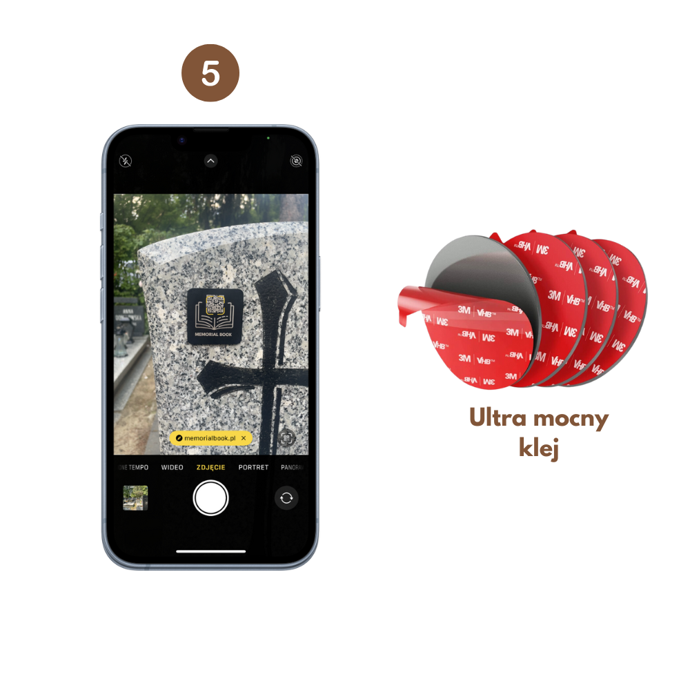 Tabliczkę z kodem QR, którą wyślemy do Ciebie od razu po złożeniu zamówienia naklej na nagrobku używając przemysłowej naklejki którą znajdziesz w pudełku z tabliczką. Specjalny kod QR będzie prowadził do uzupełnionego profilu bliskiej Ci osoby. Dzięki temu po zeskanowaniu kodu wyświetli się cyfrowy pamiętnik zmarłego z wszystkimi danymi, zdjęciami i filmami, które wcześniej uzupełniłeś/aś.
