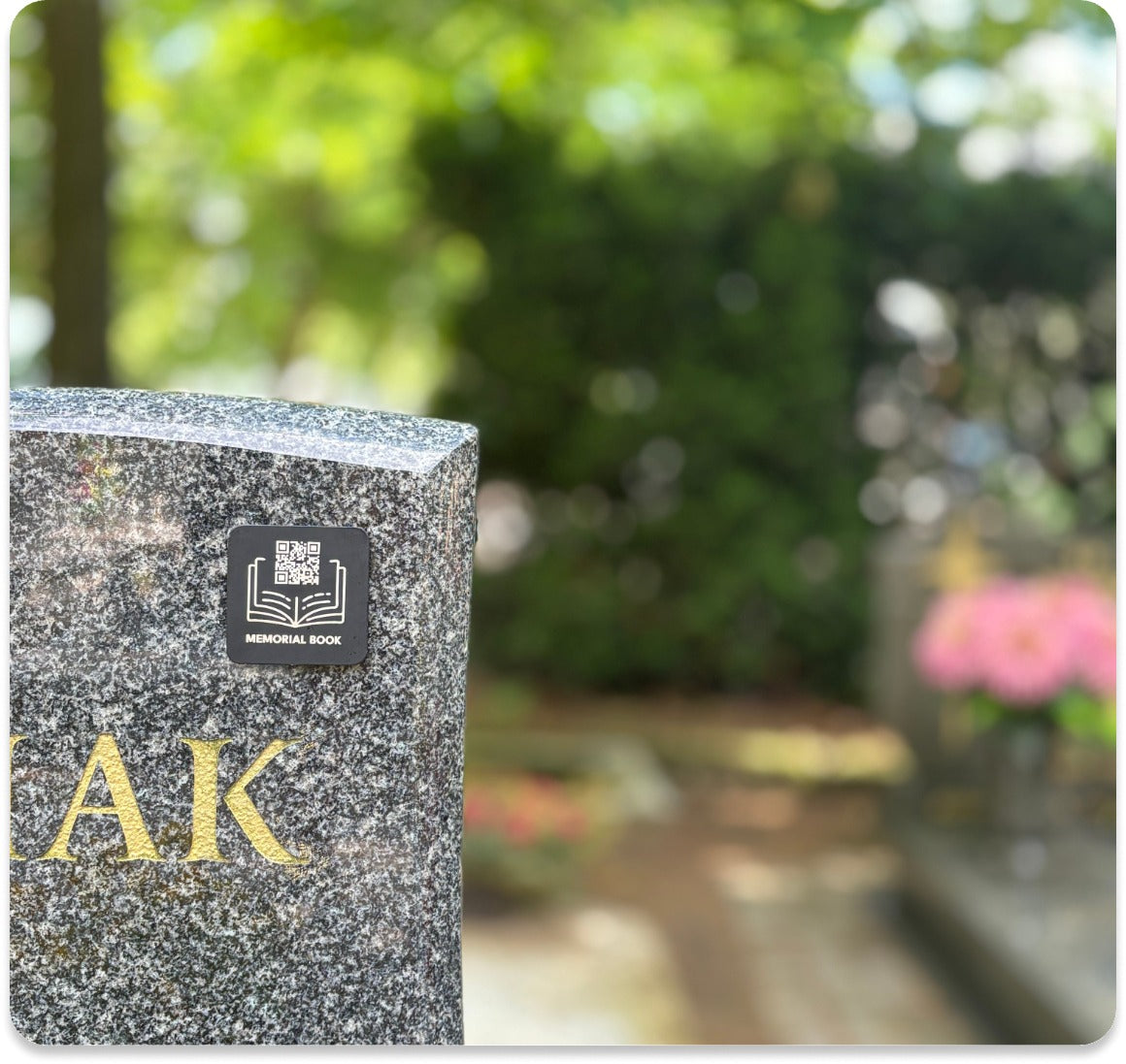 Każde zamówienie zawiera unikalny, odporny na warunki atmosferyczne pamiętnik-tabliczkę Memorial Book z kodem QR, wykonaną z wysokiej jakości aluminium, a także dołączony do niego wirtualny profil.