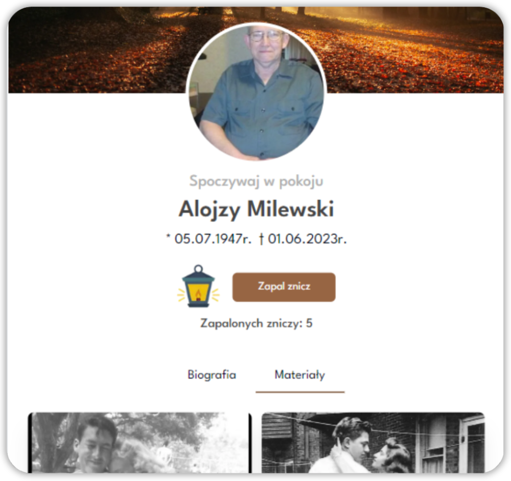 Zdjęcia, filmy oraz biografię dodajesz dopiero po zakupie na app.memorialbook.pl (profil można edytować wielokrotnie, w dowolnym momencie). Limit wynosi 100 materiałów (zdjęć lub filmów)